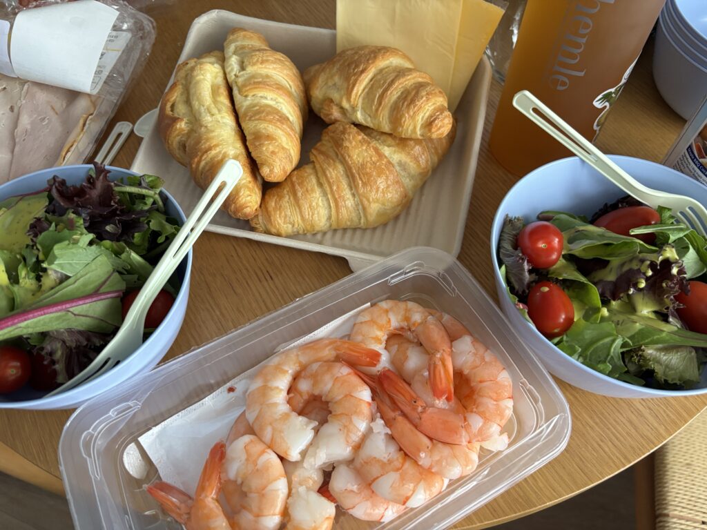 地元産の海老を豪快に、焼きたてパン、クロワッサンまいう。