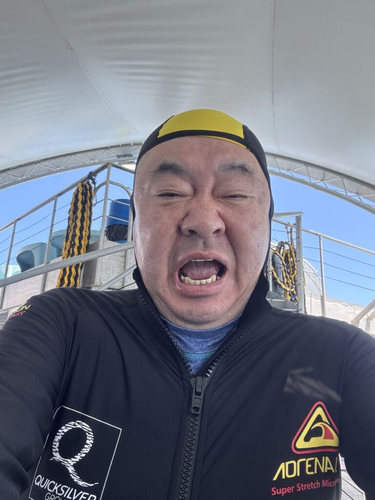 ボートでこの日のインストラクターtoshi のレクチャーを聞く。そして、マスク、フィン、ウエット、ライフガードを自分でセレクトする。