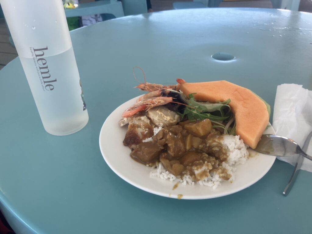 船の上で、ビュッフェ、カレーでした。ここでしっかり食べときます