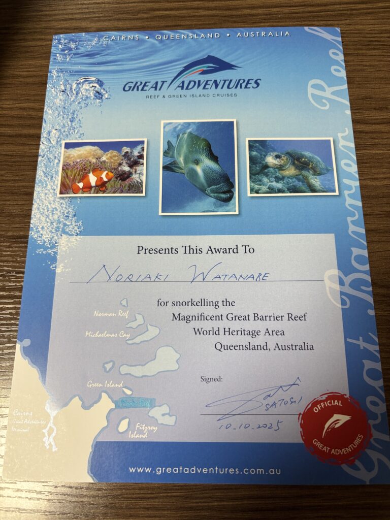 グレイトバリアリーフの修了証をいただきました。いい思い出